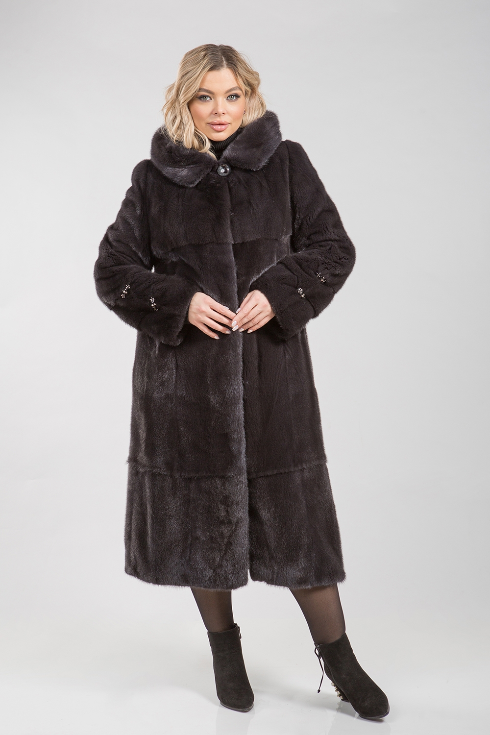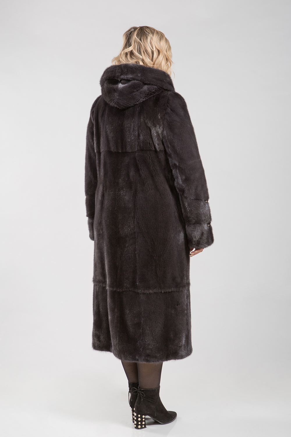 Полупальто из меха норки с капюшоном. Крой выполнен из пластин с добавлением роспуска. Модель оснащена регулирующими утяжками на рукавах и в области талии. Длина изделия — 120см.