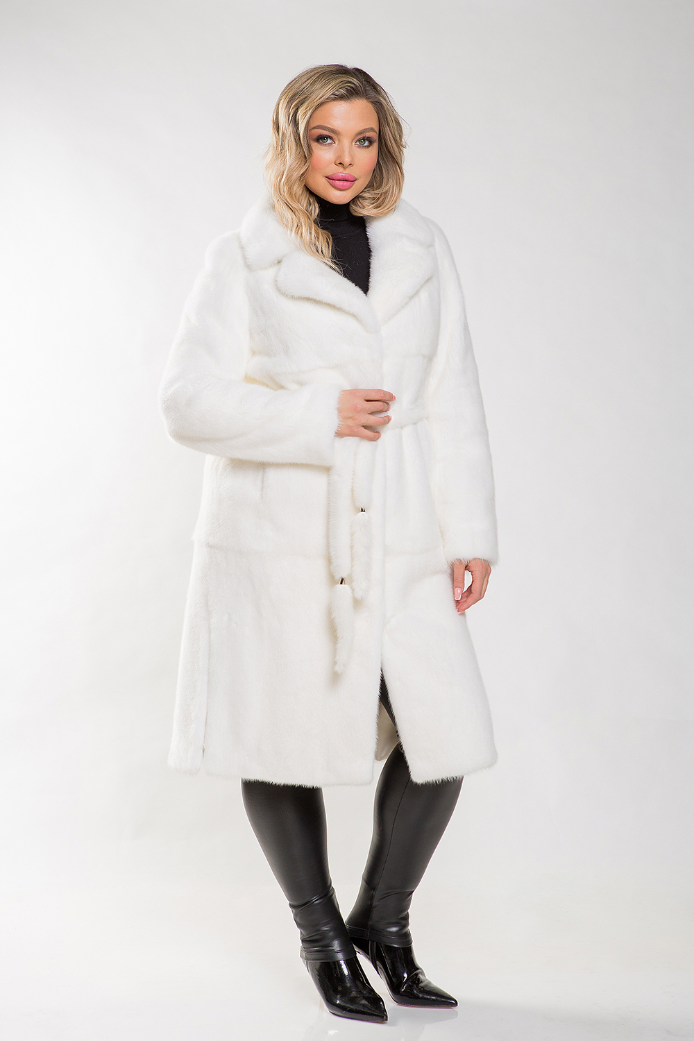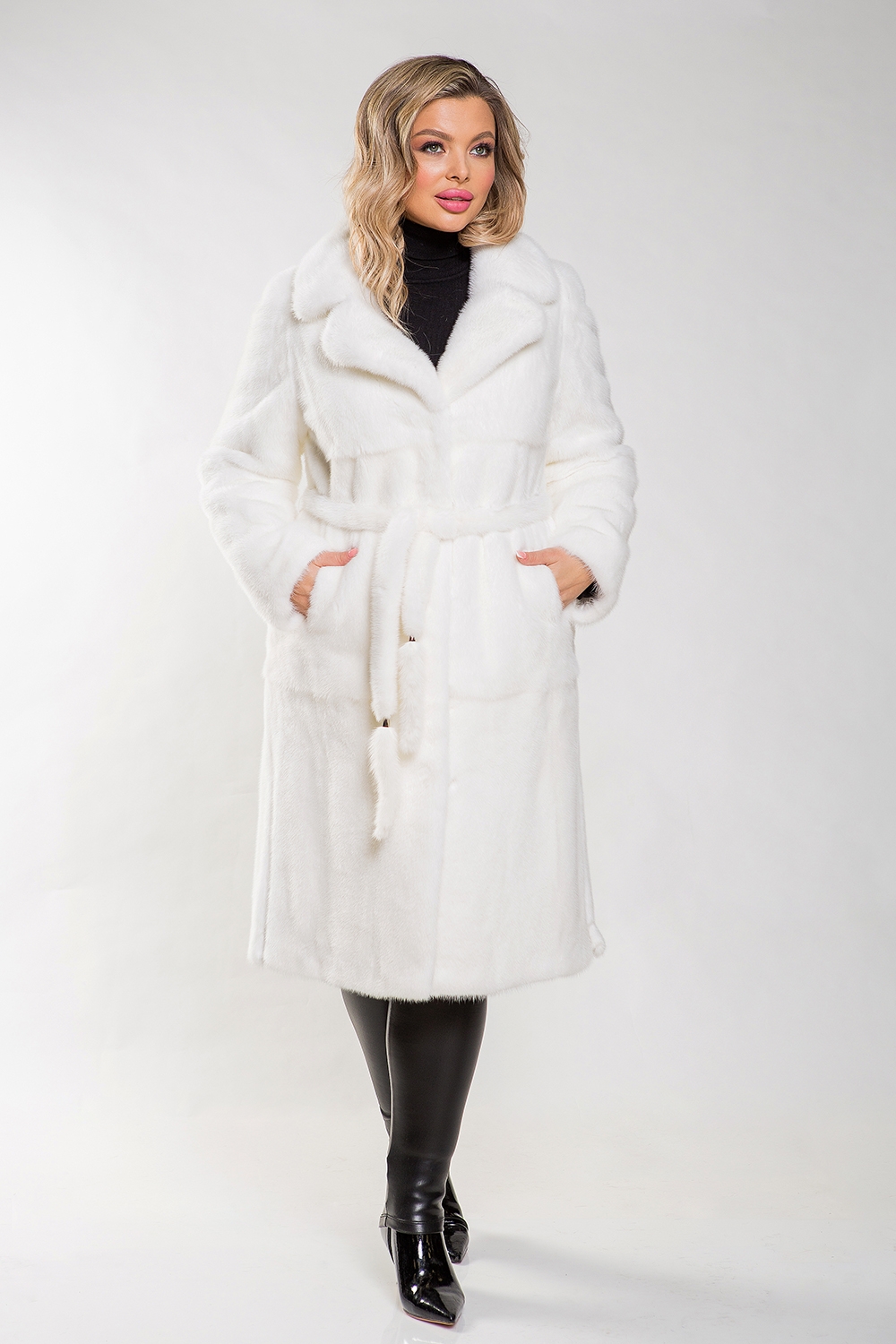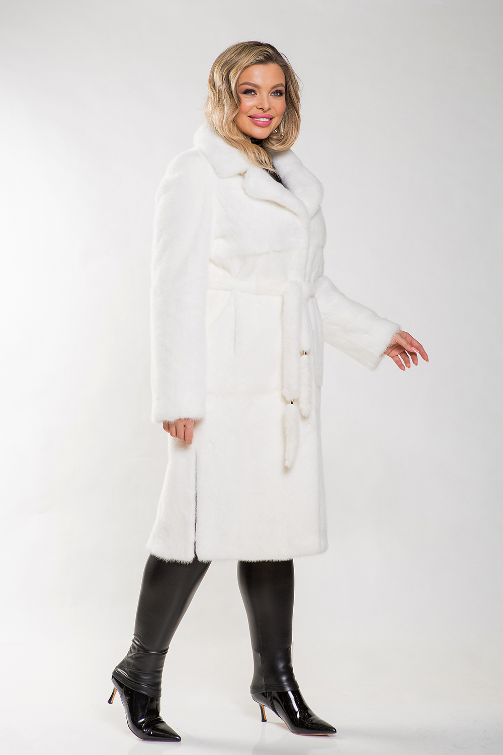 Пальто с норковым мехом и английским воротником, который можно легко превратить в классический с помощью крючка.