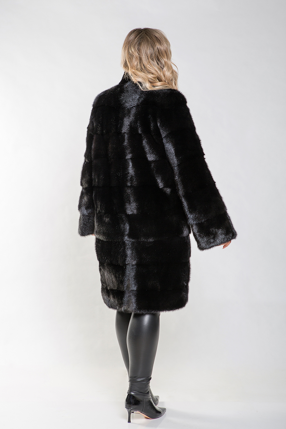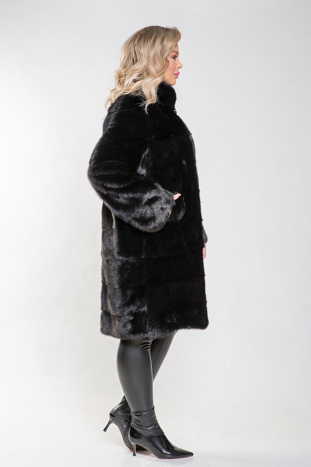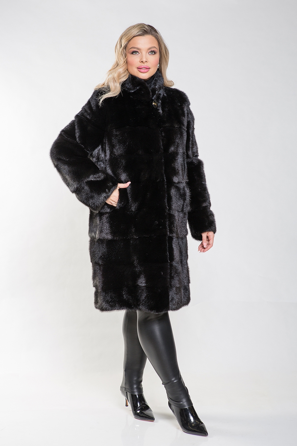 Полупальто из норки с воротником-стойкой — это настоящая находка для тех, кто ценит удобство и комфорт. Изделие отличается оригинальным кроем, в основе которого лежит поперечная выкладка пластин. Длина шубки составляет 100 сантиметров, а её главной особенностью является возможность отстёгивать рукава и низ. Благодаря этому шубка легко превращается в миниатюрную и изящную курточку.