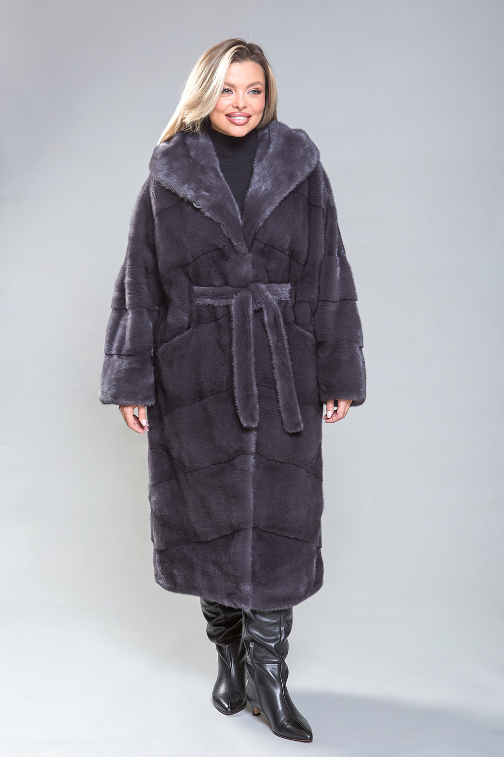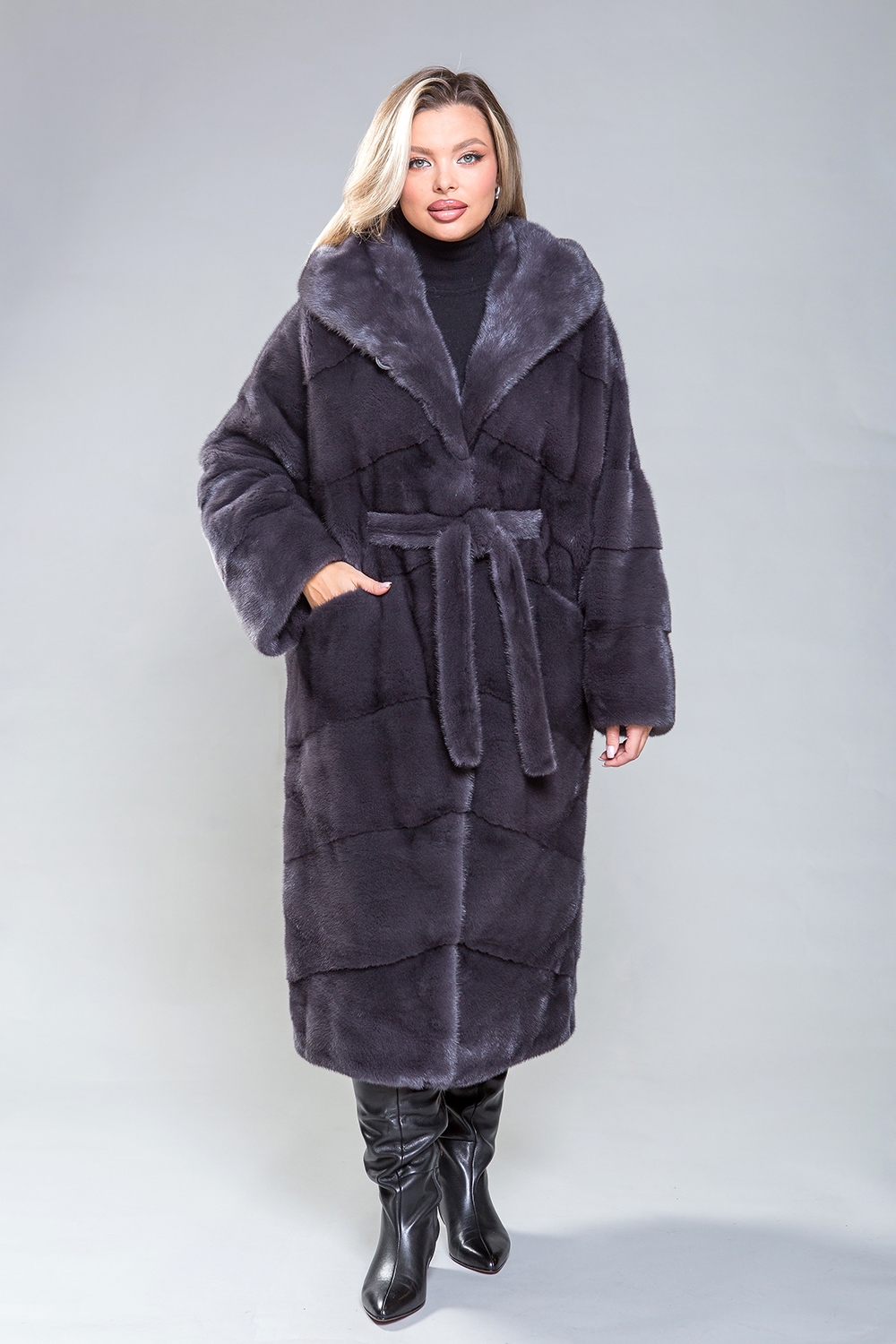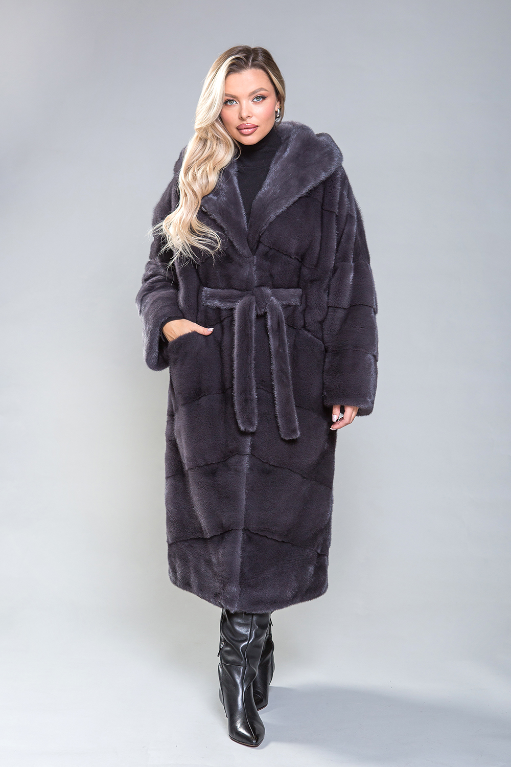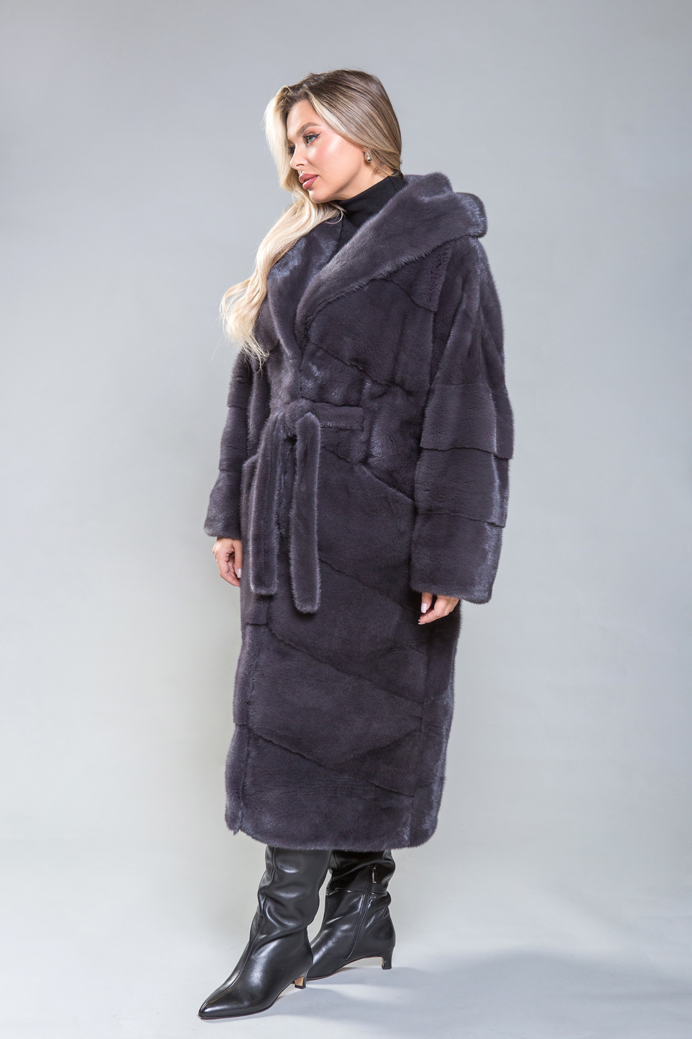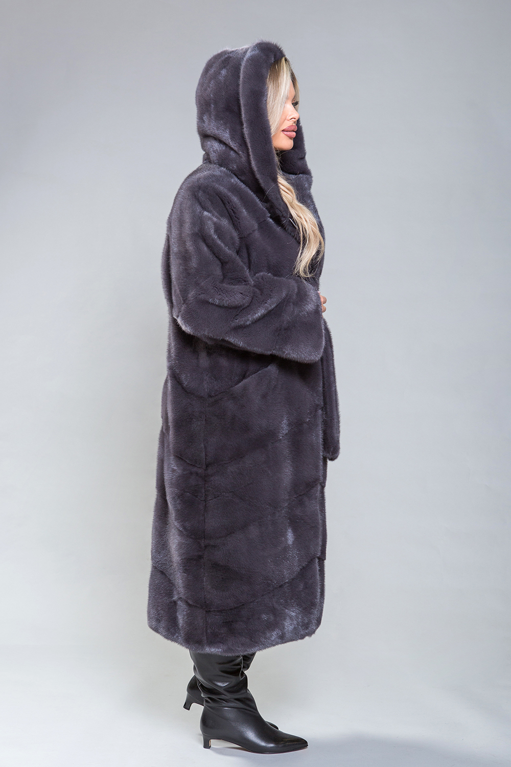 Полупальто из роскошной норки с капюшоном. Модель выполнена в технике диагональной выкладки пластин. Пояс, проходящий внутри изделия, подчеркивает фигуру. Карманы закрываются с помощью магнитов. Длина изделия составляет 120 см. Современный и элегантный дизайн модели визуально уменьшает объемы и скрывает недостатки фигуры. Это полупальто добавит уверенности и подчеркнет статус успешной женщины!