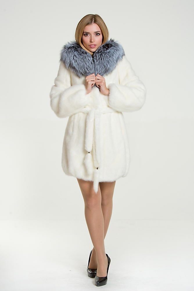 Особый шик норковому полупальто этой модели придает роскошная оторочка капюшона шикарным мехом чернобурой лисы, который обрамляя лицо обладательницы шубки, подчеркивает природную красоту.