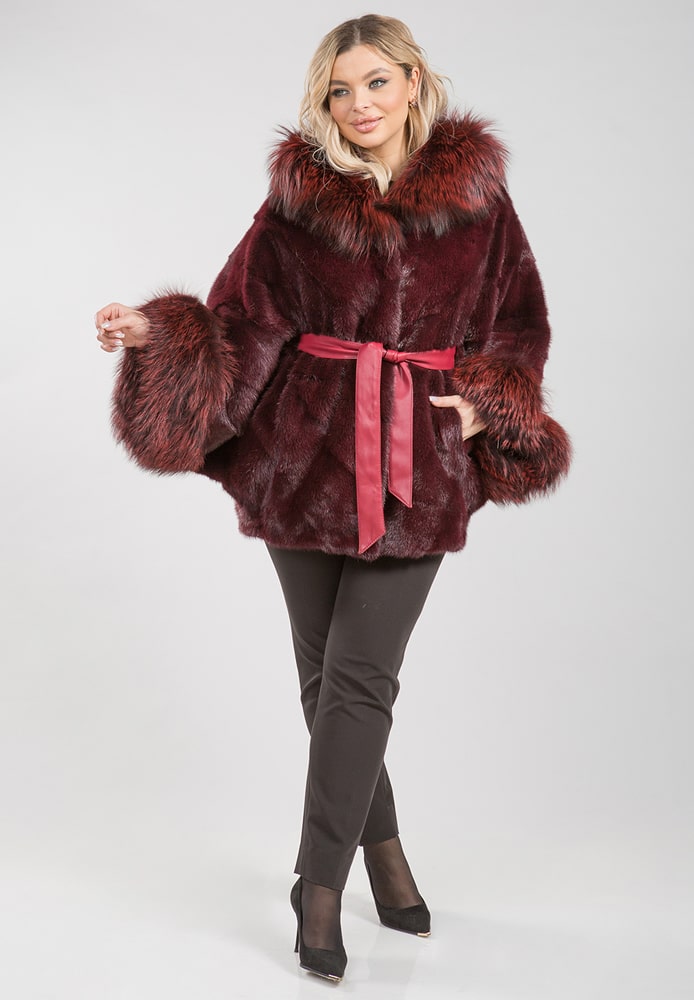 Майская скидка на куртку-пончо из меха норки цвет бордо, арт.5676